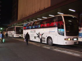 新宿駅に着いた私は西口にある京王新宿高速バスターミナルへ向かいました。午後8時45分過ぎ、福岡という行き先表示を付けた福岡ナンバーのスーパーハイデッカー3台がバスターミナル係員の笛の合図で入線してきます。車両には福岡ではおなじみの「にしてつ」のロゴがあります。「到着しましたバスは博多駅経由福岡天神行き夜行高速バス『はかた号』です。この福岡行き『はかた号』は3台運行です」というアナウンスが流れるといよいよ九州への帰路につくんだな、と実感します。「はかた号」は早速乗車改札を開始し、福岡をはじめとする九州への旅路に着く乗客を乗せます。バスのシートは夜行用の独立3列シートでゆったりとして快適です。いよいよこれから九州福岡へ向けての約14時間半の長旅が始まります。