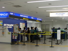 私の乗る飛行機はスカイマークの12時15分発の303便です。早速チェックインカウンターで搭乗手続きをすませ手荷物を預けてセキュリティーチェックを受けて搭乗口に向かいました。何分か搭乗口で待っていると11時50分頃搭乗の時間となり搭乗ゲートで搭乗改札を受けると私の乗る飛行機は遠くの滑走路にあるためにバスに乗って私の乗る飛行機まで行きました。飛行機の手前まで到着したらバス降り階段式のタラップから飛行機に乗り込みます。
