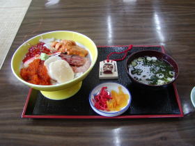 「きりたんぽ」を食べた私は昼食としてとある食堂で「まなはげ丼」というものを食べました。この「なまはげ丼」は海老や蟹・うに・いくら・イカなど様々な海の幸をおりまぜた海鮮丼で吸い物には男鹿名産の岩海苔が入っていました。そしておまけとして「なまはげ」のお守りも付いていました。この「なまはげ丼」はとても美味しかったです。