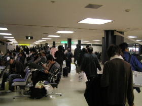 乗客はターミナルビルに着き手荷物を預けた乗客はここで手荷物を受け取ります。手荷物を受け取って出口を出た私は急いで空港リムジンバス乗り場に向かいました。ここ大阪では大阪発山形行きの夜行バスに乗車する予定ですが。山形行き夜行バスの始発地があべの橋なのであべの橋から乗車しようと思いましたが。大阪市内方面に行きの空港リムジンバスが案の定大幅に遅れる見込みとのことでした。そこで山形行きの夜行バスは梅田にも停車し梅田発の時間があべの橋発の時間の30分後ということで確実に山形行きの夜行バスに間に合うため急遽梅田で山形行きの夜行バスに乗るために梅田に向かうことにしました。