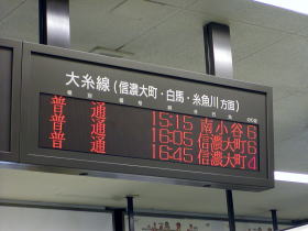 高速バスで松本バスターミナルに到着した私は隣接しているJR松本駅まで行きました。この松本駅から信濃大町まで電車で移動するわけですが、ローカル線ということもあり本数も少なく次の列車は15時15分の南小谷行きです。私は改札口を通りホームへおりて列車の到着を待っていると、14時58分頃電車が入線してきました。私は早速その電車に乗り出発を待ちました。時刻も15時15分になり信濃大町方面・南小谷行きの列車が出発しました。出発してしばらく経つと車窓も市街地からのどかな風景になりアルプスの山々を見ることもできます。列車は1時間近く走り16時28分に無事に信濃大町に到着しました。
