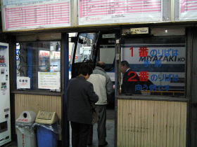 ここは宮崎駅前にある宮崎交通のバスセンターです。いよいよここから宮崎発長崎行きの高速バス「ブルーロマン号」に乗ります。この「ブルーロマン号」は九州内を走る高速バスとしては走行距離が一番長い路線です。時刻は出発時刻の直前になり大きいスーパーハイデッカーのバスが堂々とバスセンターの乗り場に入線して来ました。さっそく乗車改札が開始されました。私も大きい荷物をトランクルームに預けて,乗車改札を受けてバスの中に乗り込みました。時間は発車時刻の午前7時14分になり、バスはバスセンターを出発しました。