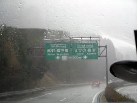 バスは宮崎自動車道を西にひた走ります。ここで私は宮崎駅で購入した駅弁を広げて食べました。車窓を眺めながらの駅弁もなかなかのものです。バスは高原ICを過ぎたころ東経131度線を通過しました。これぐらいから向って左側に霧島屋久国立公園が見えてきました。「ブルーロマン号」は左側に霧島を望みながら宮崎道をひた走ります。そして8時37分頃バスは「えびのジャンクション」から九州自動車道に合流します。