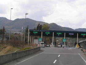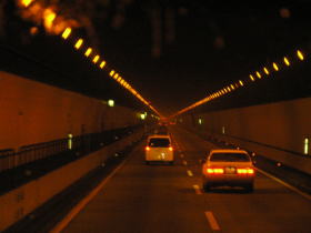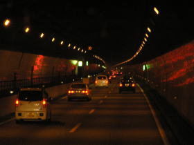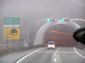 「ブルーロマン号」はえびのジャンクションも通過しいよいよ加久藤トンネルに入ります。この加久藤トンネルは、九州の中ではこの後に通る肥後トンネルに次いで2番目の長さです。通り抜けるには約4分強かかります。この加久藤トンネルの中で熊本県に突入します。トンネルの出口にも熊本県の看板があります。「ブルーロマン号」はいよいよ九州の内陸部を走ります。ですのでこのあと八代までの約40分間九州山地の壮大な山並みを走行します。