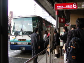ここは鹿児島のいづろにある、いづろ高速バスセンターです。今日は3月12日で新幹線開業の前日でここ日限りで熊本-鹿児島の高速バスは運行を終了するわけです。私はこの日限りで運行を終了する熊本-鹿児島の高速バスに乗車をするためにこのバスセンターにやってきました。12時40分頃、福岡行き宮崎行きの高速バスと共に熊本行きの高速バスも入線してきました。この時間の便の熊本行きは九州産交バス担当の「きりしま号」です。私はすかざず写真を撮りました。ほかの乗客もこの日限りで熊本行きがなくなるのを知っているのだろうか写真を撮る人も何人かいました。バスの中から乗務員が出てバスセンター窓口から乗客名簿を受け取り出発の準備をし12時50分頃乗車改札が開始されました。放送でも「出発便のご案内です。福岡行き・熊本行き・宮崎行き高速バスにご乗車予定のお客様はバスのほうにご乗車ください。 」とのアナウンスです。