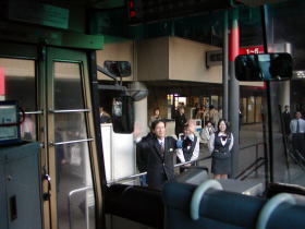 | バスに乗り込みます。 | 見送られてバスは出発しました。 |