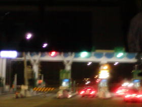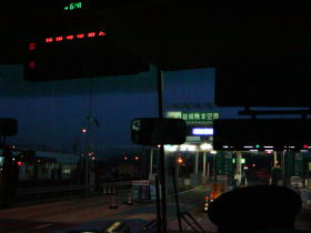 高速道に入ってからでも対向するバスに向かってお別れの挨拶をしています。松橋ICをすぎてからビデオ放送もいつもと変わらず放送が開始されました。辺りもすっかり暗くなり八代ICで乗客の乗降でいったん料金場を出ますがここで乗務員は料金場の職員の人と話をしているようです。どうやら最後のお別れの挨拶をしているのでしょうか?
