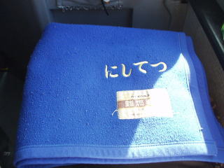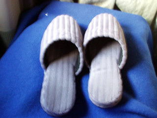 | スリッパは布製のスリッパです。 | 膝掛けは厚手で「にしてつ」の文字が入っています |