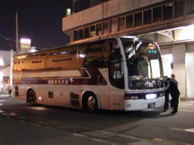 行きは寝台特急で来ましたが帰りは夜行高速バス「さつま号」で帰ります。私はその夜行バスが発着する南国日本生命ビル一階にあるバスターミナルへ向かいました。私はバスが来るのを待っていると18時50分頃バスターミナルに一台の高速バスが入ってきました。アナウンスでも「お客さまにお知らせします。大阪梅田行き『さつま号』が入線してきました。