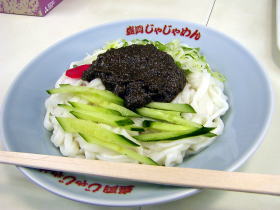 「啄木新婚の家」を見終った私は腹が減ったので昼食をとることにしました。ただせっかく盛岡に着たので盛岡ならではのを食べたいと思いました。盛岡ならではの食べ物といえばわんこそば・冷麺なども有名ですが、「じゃじゃ麺」というのに私は興味が引かれ私はこのじゃじゃ面を食べることにしました。早速「じゃじゃ麺」が食べられる店に入り「じゃじゃ麺」を注文しました。出された「じゃじゃ麺」はゆでたうどんの上に刻んだキュウリと長ネギ、肉味噌がのっていました。早速食べましたが麺と肉味噌がうまく絡んでとてもおいしかったです。