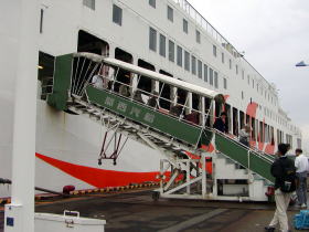 しばらく経つと乗船開始のアナウンスがありタラップから船に乗り込みます。船はあの関西汽船のサンフラワーです。このフェリーは松山・神戸経由便のために大阪までの時間が15時間半とかかりますが直行便でしたら11時間半ほどで到着します。