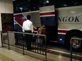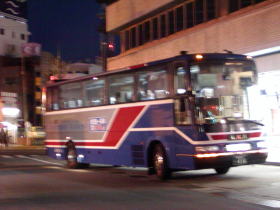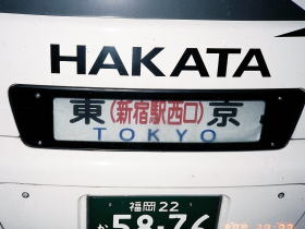 バスは福岡ナンバーで「にしてつ」のロゴが入っていながら方向幕には「東京(新宿駅西口)」とちゃんと表示されています。東京へ行く移動手段の中で地元の会社の運行で行けるのはこの「はかた号」だけです。またこの「はかた号」の出発は19:00ですがこの時間は東京行き最終の新幹線はすでに出発しています。いよいよ乗車改札が開始され、乗車準備が整ったところでいよいよ天神BCを出発します。バスのシートは夜行用の独立3列シートでゆったりとして快適です。バスはスロープを降りて渡辺通りを走行し那珂川を渡って博多へ、住吉通を通って右に博多駅の駅ビルを眺めながら博多駅交通センターに入り、残りの乗客を乗せてます。いよいよ東京へ向けての長旅の始まりです。九州道を快走
