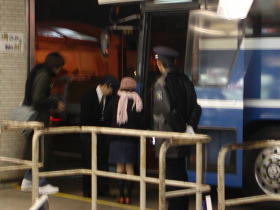 18時30分天神BCを鹿児島行き「桜島号」が5番乗り場を出発してから、出発案内のLED表示下の段には東京行き「はかた号」の表示がでてきました。同じ乗り場を利用する他の路線の乗客は「高速バスで東京までいけるの〜」と驚きの様子です。しかも今日は年末ということもあり5台運行です。しかも2号車は女性専用車「博多の女号」です。しばらくたつと放送でも「はかた号」のアナウンスがあります。そして職員らしき人がバスに積み込む軽食を乗車場まで運んでいます。発車直前になると案内係の人が口頭で「5番乗り場には先に鹿児島行き『桜島号』が到着します。なお東京新宿行き夜行高速便『はかた号』は鹿児島行きが出発しだい入線します。なお本日の東京行きはバス5台で運行いたします。お手持ちの乗車券の号車番号をご確認ください。」とのアナウンス「桜島号」が発車した後に「はかた号」2号車が5番乗り場に入線しました。なお1号車の乗り場は6番乗り場に変更され6番乗り場に1号車が入線してきました。