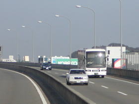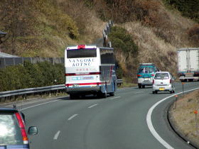 いよいよ九州に別れを告げ本州に突入した「はかた号」は中国道を快走しています。東京までは本州の約半分の動脈を走ることになります。中国道ではカーブと勾配が連続しており、中国山地の壮大さを実感させます。21時10分頃いったん美東SAに停車しここで車両点検をします。そして再び高速道を走ります。21時20分過ぎに山口JCTを通過し山陽自動車道に入線します。この山陽道は中国道よりも新しく開設されましたのでカーブや勾配が少なくなっています。そのかわり短いトンネルが頻繁に出るようになり、これからも中国山地の山並みを堪能できます。