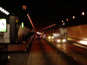 バスは大博通りを進み呉服町ランプより福岡都市高速に入線します。ここから東京新宿まで信号は一つもありません。ここから東京の高井戸ICまでの間はひたすら高速道路を走るのです。車内では設備案内のビデオが放映され、続いて乗務員の紹介と休憩地および到着予定時刻の案内が行われました。運転手は2名乗車して途中交代しながら運転していくようです。そして都市高速を走り終わりダイレクトに福岡ICから九州自動車道に入ります。しばらく落ち着いてきたところでさっきデパ地下で購入した弁当を広げて夜の車窓を楽しみながら食べます。バスに乗りながらの弁当もなかなか良いものです。九州道を難なく走り、対向車線を走る西鉄高速バスに見送られるようです。しばらく経つと左側に北九州の夜景が見えます。そして新門司港を眺めつつ短いトンネルが何個か出てきたところでもうすぐ本州です。そしていよいよ関門橋です。この時間、関門橋はイルミネーションされてとてもきれいです。また門司港や下関港も眺められます。20時35分頃、関門橋を渡りきると山口県に突入です。中国山地を快走