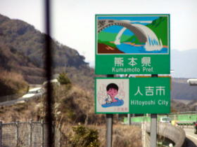 「桜島号」はさらに走り続け7時40分頃北緯32度線を越えて右側に霧島国立公園を望みながら鹿児島県に別れを告げて宮崎県に入ります。すぐさま、えびのジャンクションも通過しいよいよ加久藤トンネルに入ります。この加久藤トンネルは九州ではこの後通る肥後トンネルに次いで2番目の長さです。通り抜けるには約4分強かかります。この加久藤トンネルの中で熊本県に突入します。トンネルの出口にも熊本県の看板があります。並行する特急「つばめ」は海沿いを走るのに対して「桜島号」は九州の内陸部を走ります。ですのでこのあと八代までの約40分間九州山地の壮大な山並みを走行します。
