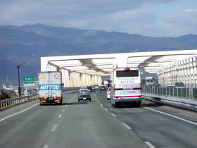 熊本ICを過ぎると熊本から福岡・長崎などへ向かうバスも並行して走るようになり心強くなります。9時15分頃「桜島号」は熊本を後にして福岡県に入ります。バスは久留米インターチェンジを目前にして左側に「成田山久留米分院の慈母大観音」が見えます。久留米インターチェンジを通過して筑後川を越えますこの筑後川にかかる橋は珍しく鉄橋になっています。バスは筑紫平野をひた走り鳥栖JCTを通過します。ここまで来ると鳥栖ジャンクションからは長崎や大分など他の方面から福岡に向かうバスなどが並行して走るようになり高速バスの数も多くなります。まさしく高速バス街道といった感じがします。
