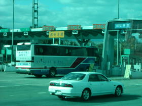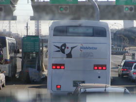 そのあと「はかた号」は小仏トンネル通過します。9時20分頃トンネルを出ますと前方に「東京都」という看板が「はかた号」を出迎えます。つまりついに東京に突入です。福岡から実にのべ15都府県目です。山だらけだった車窓もだんだん都会になって9時50分頃に高井戸ICから首都高速に入線します。福岡ナンバーをつけた九州のバスが首都高速を快走する姿はなんとも勇ましいものです。ここまでくると終点新宿はあともう少しです。「はかた号」はビルの谷間を走るようになりビルに写る「はかた号」の勇姿を再確認できたりもします。まもなく前方に新宿庁舎が見えてきました。ここまでくると終点新宿はもうすぐです。しばらくしバスは首都高を降り甲州街道を走ります。まもなく交代乗務員がマイクを取り「皆さん長らくのご乗車ありがとうございました、まもなく終点東京新宿駅西口です。」とのアナウンス。バスはまもなく交差点を左に曲がり予定よりも約40分遅れで新宿駅西口にある京王新宿高速BTに到着です。
