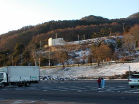 雪が降っています。朝日を浴びながら諏訪湖SAで休憩する