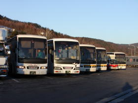 私の乗るバスは3号車です。2号車が出発してから3号車が5番乗り場に入線してきました。