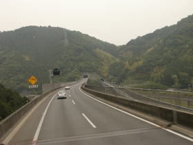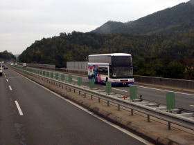 バスは11時25分過ぎに山口JCTを通過し山陽自動車道に入線します。この山陽自動車道は中国道よりも新しく開設されましたのでカーブや勾配が少なくなっています。そのかわり短いトンネルが頻繁に出るようになり、これからも中国山地の山並みを堪能できます。12時20分頃「山陽道昼特急博多号」は山口県に別れを告げて広島県に突入です。バスは大竹JCTから広島岩国道路に入ります。ここから廿日市JCTまでは高速道路ではなく一般有料道路でありながら山陽自動車道の中に含まれているという珍しい有料道路です。途中右側には厳島神社がある宮島が見えます。