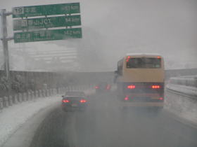 バスはひたすら走ります。途中雪が降ってきました。雪が降る中もバスは走り北緯39度線を通過し、その数分後に宮城県に入りました。次第に雪が多くなりバスは慎重に走ります。バスは宮城県内を走行し仙台市に入ってしばらくたつと東北自動車道の中間点を通過しました。そして降雪が激しくなり速度制限もなされさらに慎重に東北道を走ります。