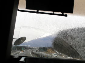 バスが走行していると「東京まで640Km」という看板がありました。バスは秋田から岩手県に入りました。出発してから約1時間が経っています。バスはいよいよ安代ジャンクションを通過します。バスは竜ヶ森トンネルを通過します。トンネルを通過してしばらくたつと東北自動車道の最高点(475km地点)を通過し、前方に雪化粧した岩手山がきれいに見えました