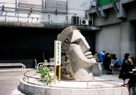 このモヤイ像はJR渋谷駅南口にあります。渋谷駅といえばハチ公の像が有名ですが、このモヤイ像も形が珍しいことからハチ公とともに待ち合わせスポットとなっています。浅草