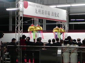 自由席の乗客・指定席の乗客共に乗車し発車時間である6時を待ちます。開通セレモニーもあと残すは第一便の出発とテープカット・くすだま割りを待つだけです。出発時刻の6時になり駅長および一日駅長の子供の合図により新幹線「つばめ30号」は汽笛を上げながら出発していきました。同時にテープカット・くすだまも割られました。
