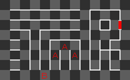 開幕は緑の敵に注意しながら、図上のAの付近でアイテム「L」と「A」を回収。図上のBの付近にアイテム「C」が出るが、回収しない方が良い。回収してしまうと、あちこちにアイテム「L」が出てしまい、白と緑色の敵に拾われやすくなる。