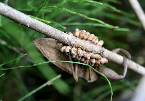 黒っぽいのが1令幼虫、緑のが2令幼虫。成虫は先の1匹のみしか確認できず。産卵が終わって方々に散って行った後なのだろう。