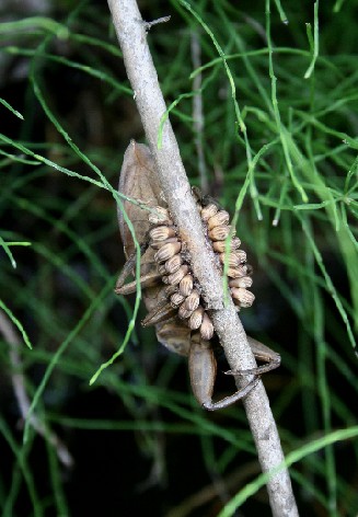 淀みの中には、子タガメがたくさん泳いでいた。タガメの卵には間に合わなかったか・・・となかばあきらめかけた時、繁みの中にカマキリの卵塊のようなものが目に飛び込んできた。よく見るとやっぱりカマキリの卵。待てよ・・・。その奥にもうひとつカマキリの卵のようなものがある。れれれ・・・。タガメじゃん。しかも、しっかりと卵を守っている。僕が近づいても一切動かず、ひたすら卵を守り続けるオスの姿に感動。