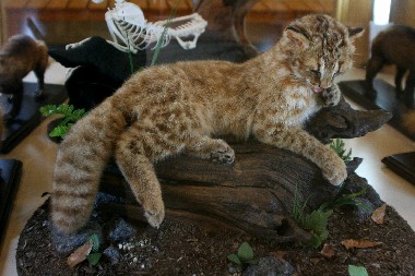下がしっぽの大きなツシマヤマネコの剥製だ。