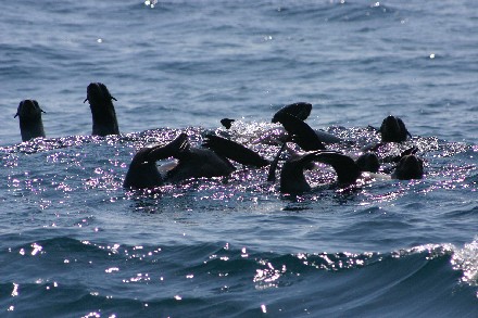| ウォッチングのコツ・・・・北へ向かうフェリー航路で見られることがるようだが、なかなかフェリーに乗る機会を作れないし、乗っても確実と言うわけではない。千葉県銚子市で、オットセイのウォッチングクルーズをしているので、参加するとよい。銚子沖では2月から3月。イルカやクジラが主役とおもわれがちだが、オットセイを一度見ると忘れられない。意外とのんきに人間をみて、プカプカ浮いていて、楽しい観察が満喫できる。 |