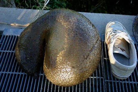 繁殖力の強い外来種らしく、夏に沼などで大発生して騒ぎになったりします。 関東周辺では、気をつけて水辺を探してみると、けっこういろんなとこにいます。ちなみに、スケール代わりのスニーカーは、27cmです。 (群馬県館林市・多々良沼にて)