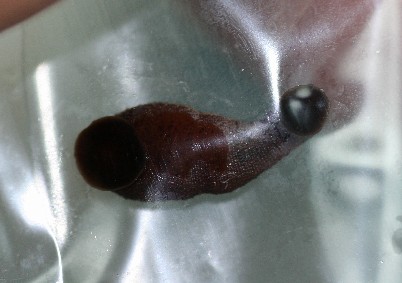 ぽんぽこにとりついていたヤマビルは、下の写真の個体。まだ、皮膚を食い破る前だったが、一度吸いつかれるとなかなかひっぺがせられない。爪を立て、そうとう力を入れて、やっとはずれた。すると今度は、すばやい動きで僕の指やら爪に吸いつく。もう手がつけられない。なんとかビニールに突っ込んで、ようやく撮影開始。