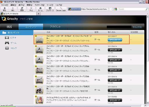 4.入力に成功したら「コンテンツ」タブをクリック。PSストアのダウンロードリストが表示されているので、ダウンロードしたいアイテムをクリック。