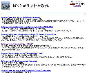 さて、その「ぼくらが生まれた現代」のボタンをクリックすると、右の画像にあるような「現代」に関わる内容をコンテンツとする色々なホームページのリンク集のページが現われまして、リストのトップには「泉谷しげるの『日本をすくえ!』のホームページ」が紹介されています。右の画像で言いますと、上から4番目には、「お父さんやお母さんが小学生だったころの流行(りゅうこう)」という見出しで、なんと、この「60年代通信」も紹介していただいているわけであります。