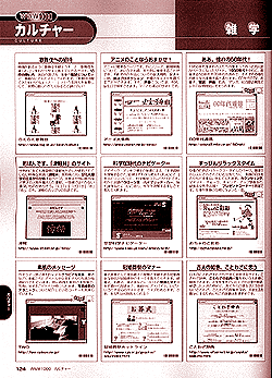 さきほども書かせていただいた通り、『ホームページガイド』は16のジャンルに分けて様々なホームページを紹介しているわけですが、ページ構成的には、「ショッピング」から「動物」までの11ジャンルは4色のカラーページですが、「アミューズメント」から「地域情報」までの5ジャンルについては、モノクロページになっています。