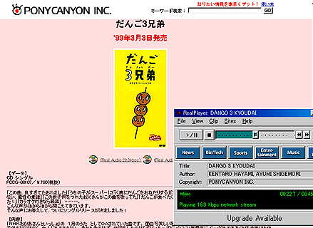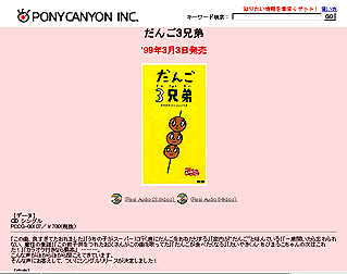そのポニーキャニオンのサイトにある「だんご3兄弟」のプロモーション・ページには、次のように書かれております。 -------------------- 「この曲、良すぎてたおれました」 「うちの子がスーパーに行く度に、だんごをおねだりする」 「家内が“だんご”と叫んでいる」 「一度聞いたら忘れられ ない、魔性の童謡」 「この前子供をつれたお父さんがこの曲を歌ってた」 「だんごが食べたくなる」 「たいやきくん・ちびまるこちゃんの次はこれ だ!」 「カラオケ付きなら最高」 ………。 こんな声が後から後から聞こえてきています。 そんな声にお答えして、ついにシングルリリースが決定しました! -------------------- 基本的には、宣伝用の煽り文ですので、その分は、割り引いて考えなければなりませんが、要するに、そういうことだそうであります。 さらに、シングルCDの内容として、次のように説明されています。 -------------------- 「NHKおかあさんといっしょ」の1月のうた としてOAされていた曲です。 面白可笑しい歌詞、親しみやすいメロディー、そしてタンゴのリズム。 子供だけではなく、大人にもおおうけ! それもそのはず、作詞をしたのは「ポリンキー」「ドンタコス」等最高にインパクトのあるCMを手掛けた佐藤雅彦さんなのです。 とにかく、1回聞けばこの曲の良さがわかりますよ! -------------------- ということで、NECの「バザールでござーる」などでも知られる、あの佐藤雅彦さんのプロデュースによる作品だったわけでありまして、そうすると、やっぱり電通あたりが裏で仕掛けたのではないかなと勘ぐりたくなりますが、でも、ウチの次男なんかの実例を身近に見ていると、仮にそんな仕掛けがあったとしても、幼稚園児にとっては、そんなことは全く関係なく、子供たちは「だんご」が大好きなわけでありまして、だからこそ、そのナゾを探りたくなるのであります。