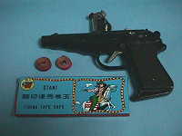 私も、昨年の10月10日と11日の両日、府中市にある郷土の森という大きな公園で開かれた「郷土芸能と縁日の森」というお祭りの際に、巻き玉ピストル2丁と巻き玉をしこたま買い込んできて、長男と次男と一緒に、聖蹟桜ケ丘付近にかかっている京王線の多摩川鉄橋で、大いにピストルの撃ち合いを楽しみました。 その時に使った巻き玉ピストルと巻き玉が、右の画像でありまして、本当は、「60年代のおもちゃ・遊び」で紹介させていただくつもりでしたが、日本テレビの映像が非常に嬉しいものでありましたので、今回は、ここで、特別公開させていただきます。