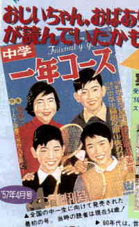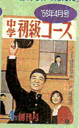 「中学1年コース」の今月号(1999年3月号)に掲載されているグラビア記事「表紙プレイバック」によりますと、「中学1年コース」という名称での創刊は1957(昭和32)年の4月号だったそうですが、その前身ともいうべきものとして、1950(昭和25)年に受験生を対象とした「中学コース」が誕生し、さらに、1956(昭和31)年には、“中学生活の楽しさを伝える”「中学初級コース」に変わり、現在に至るコースの基礎が築かれたと説明されております。