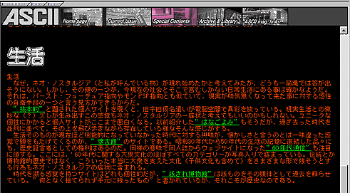 生活そのものが現在ほど機能的になっていなかった時代に対する興味が,懐かしさと言うのとは一味違った感覚で頭をもたげてくるのが,”懐古館”のサイトである。昭和30年代から50年代の生活の記憶に直結した品々にも,歴史証言者としての権利はあるのだ。同様の意味で同人誌からウェブサイトになった”60年代通信”も注目に値する。ここには,'60年代に関する大衆文化のほぼすべてのカテゴリーが写真入りで詰まっている。伝統とか博物館的歴史ではなく,こういった本当に大衆を支えた文化(子供文化も含めて)をさまざまな形で残そうとする行為もネオ・ノスタルジアの症状に含まれる。