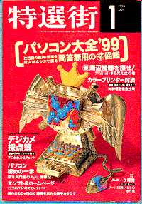 その『特選街』の1999年1月号は、「パソコン大全'99」という特集をメインに、「(優)周辺機器を探せ!」、「デジカメ採点簿」、「カラープリンター対決」、「パソコン初めの一歩」などのサブ特集が並び、文字通り、1999年のPC購入ガイド決定版を目指そうとする編集意図が明確に示されております。