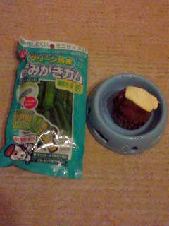 | 大好きな歯みがきガムもプレゼント! プチケーキの後は歯みがきガム、カミカミしたワン。 |