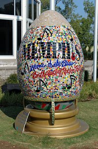 テネシー州観光案内所前に置かれた卵形の石碑です。この背景に、文字通りピラミッド型をしたピラミッドアリーナが見えます。観光案内所はミシシッピ川沿いにありますが、その近くからモノレールか、モノレールの上の橋を歩いてマッドアイランドと呼ばれる中州まで行けます。