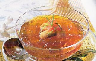 板ゼラチンを使う場合は、最初にしっかりと水に漬け弾力がでるまで、しっかりとふやかしてください。でないと、熱して溶けないので、固まりせん。より簡単になるように、粉寒天が簡単で速いです。 |
