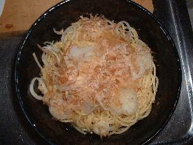 4.パスタとバターが十分からんんだら、器にいれ、2のつゆをかけ、切ったねぎ、大根おろしをのせ(水分を切る必要なし)、最後にカツオ節をかえければ出来上がり。