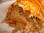 というのは、オムを焼く温度が高すぎたことです。表面がしわしわになってしまったんです。しかも2つフライパン使わなかったので、ちょっと焼きそばのコゲがついてしまいました。でも味は、GOODでした。 |