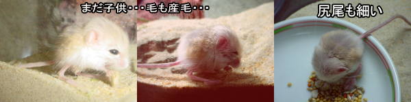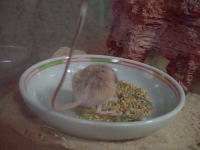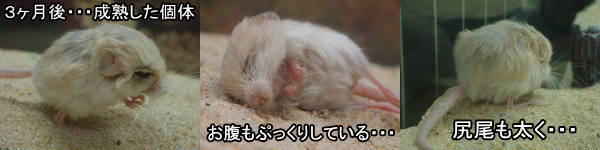 | 私の所にいる<あじ>は飼い始めの頃体も小さく、多分産まれて2ヶ月ぐらいしか経っていない子だと思いました。尻尾も細く、顔もまだ幼いです、毛並みも産毛のような感じでした。この頃は飼い方も単独飼いが主流で、ペアで購入された方もセパレーターで区切ったりして、個々の観察、状態上げに専念できました。結果的に考えるとそれが今の健康状態を作り上げたと思います。餌の分量とかとにかく気にしたものです・・・。 ぷちと同居にしたのも1ヶ月ほど2匹の状態を上げてからです、一緒にしてからも相性はいいか?など凄く気にし、いつでも分けられる状態にしていました。現在、複数飼いが主流になりつつあり、(管理人含め)多くの方がいきなり同居させてから、また少しトラブルが増えたように思います。やはり、最初は個別で状態を上げる方が良いと思います。 あじは飼い始めの頃は体重が3g満たない程度だったと思います。現在では倍以上の7gあります。体も成熟しきったようで発情の様な行動も見られました。 |